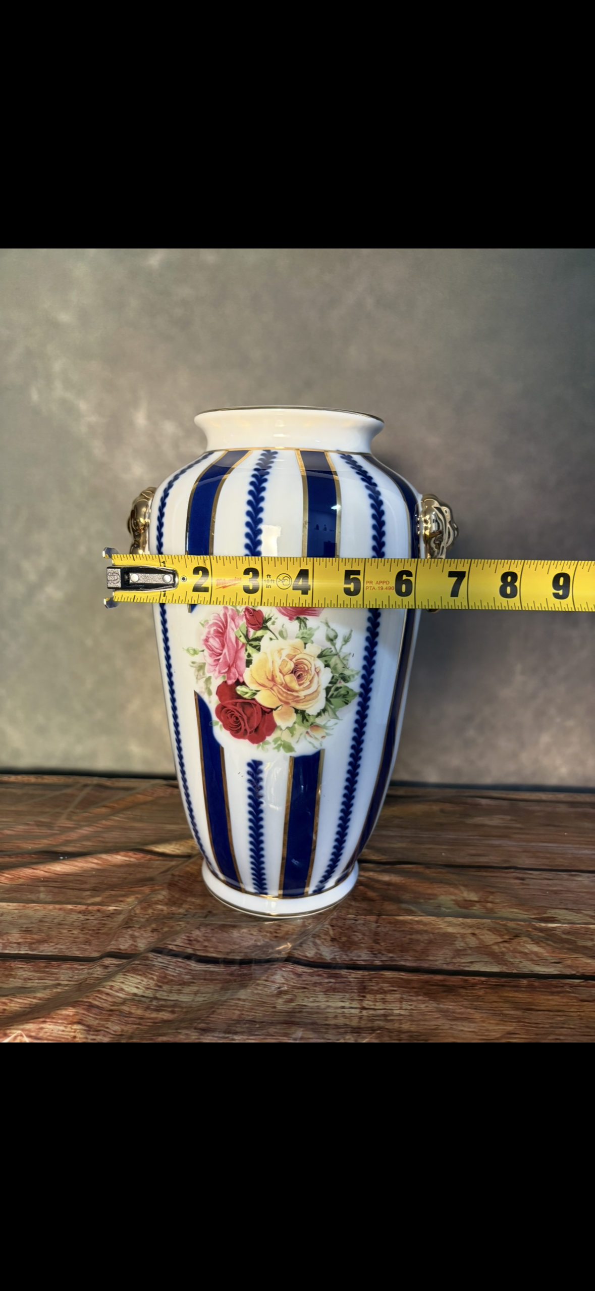 Signed Limoges Porcelain Vase — Blue & Gold Stripes with Rose Bouquet